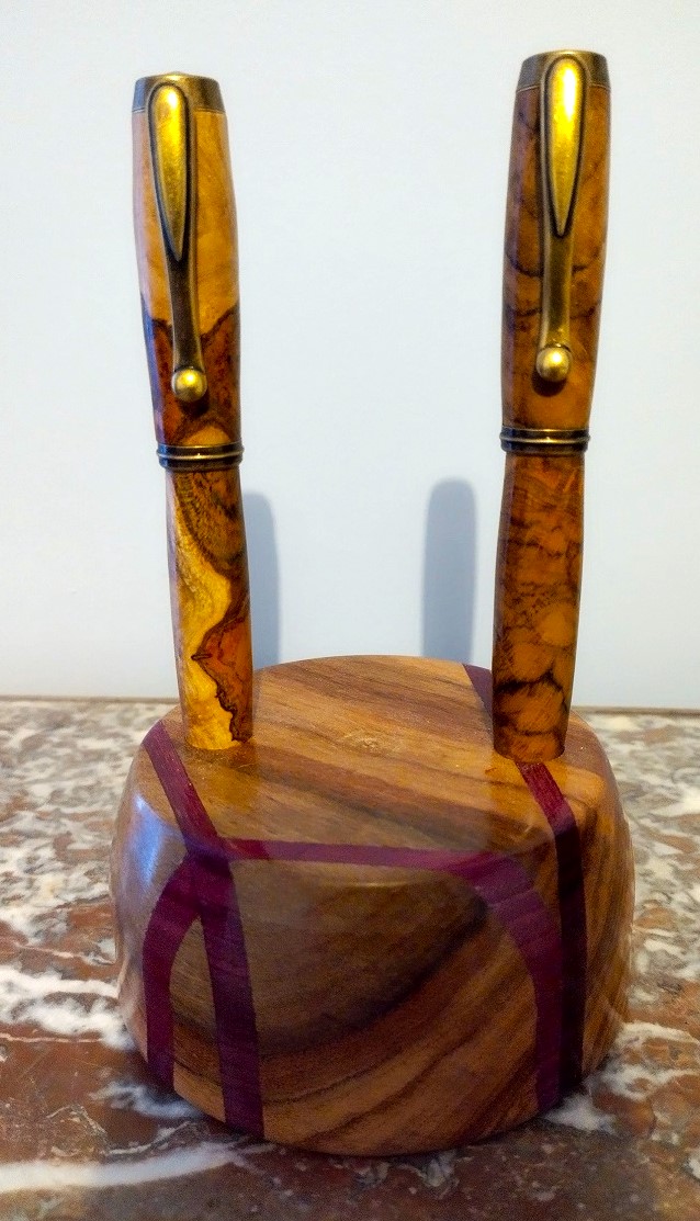 J’utilise différents mandrins pour le tournage des stylos, m’offrant la perspective de réaliser soit un objet conforme à l’idée qu’on se fait d’un stylo, soit, grâce au « tournage borgne » de concevoir des corps de stylos à la forme inattendue.