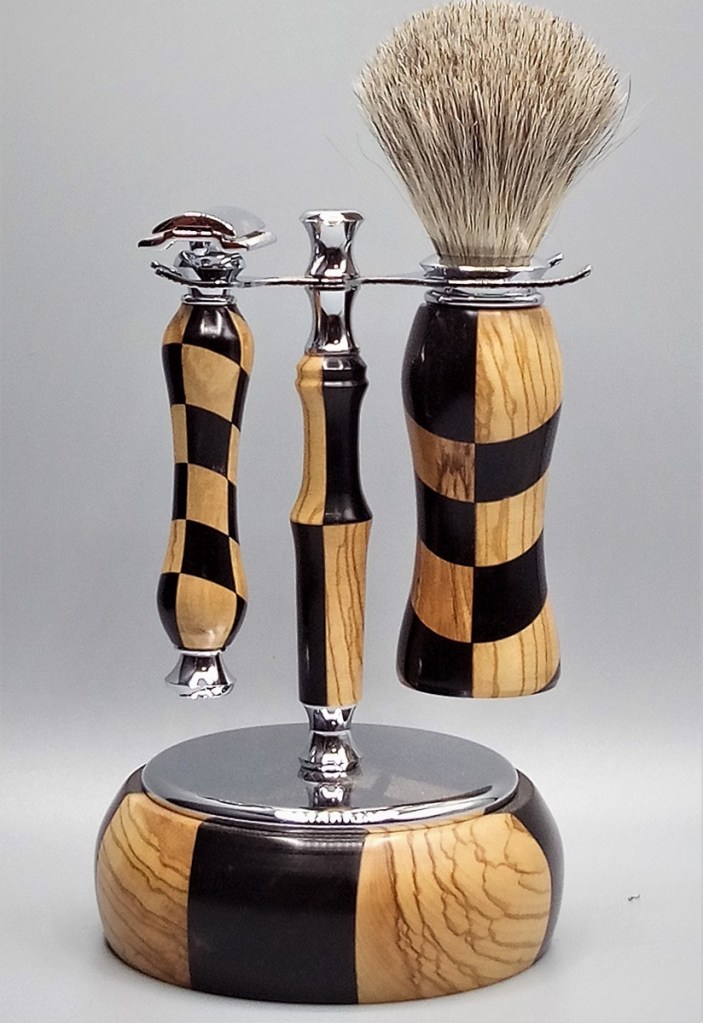 Ensemble de rasage assemblage en damier en Olivier et ÉbèneVaporisateur assemblage damier en bois d’oranger et ÉbèneVaporisateur montage en damier avec de l’Olivier et du Red Heart