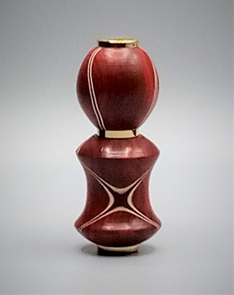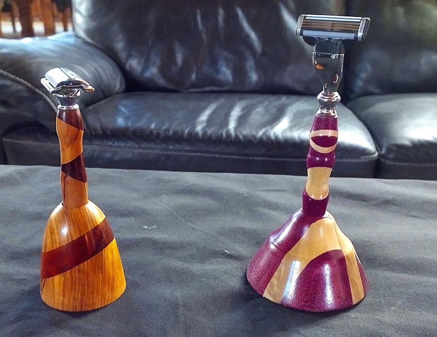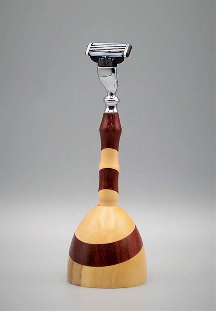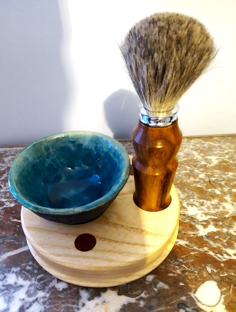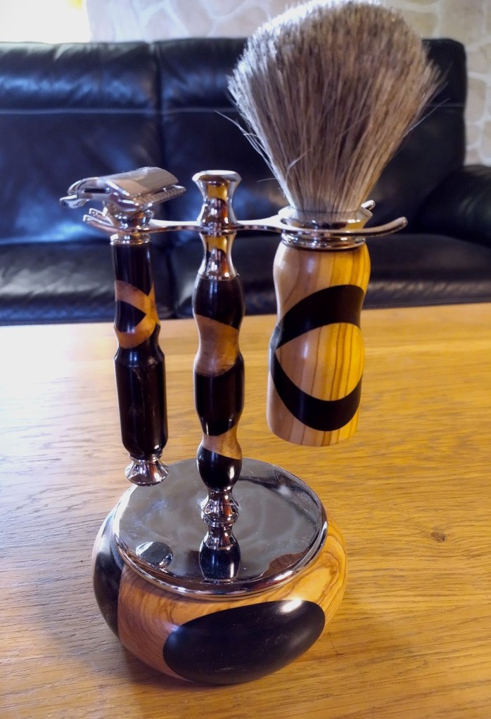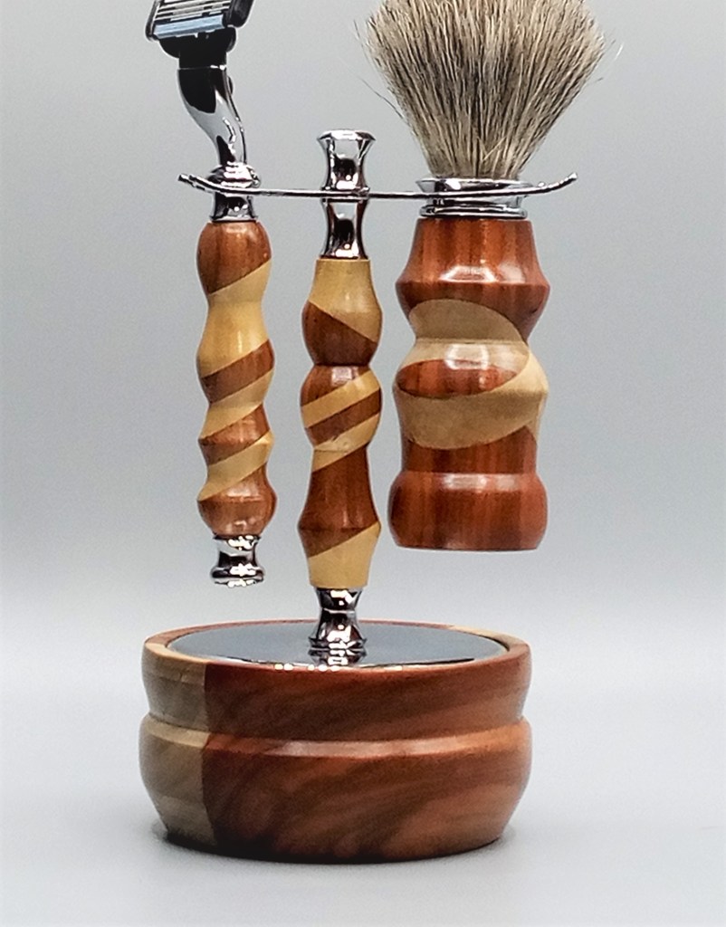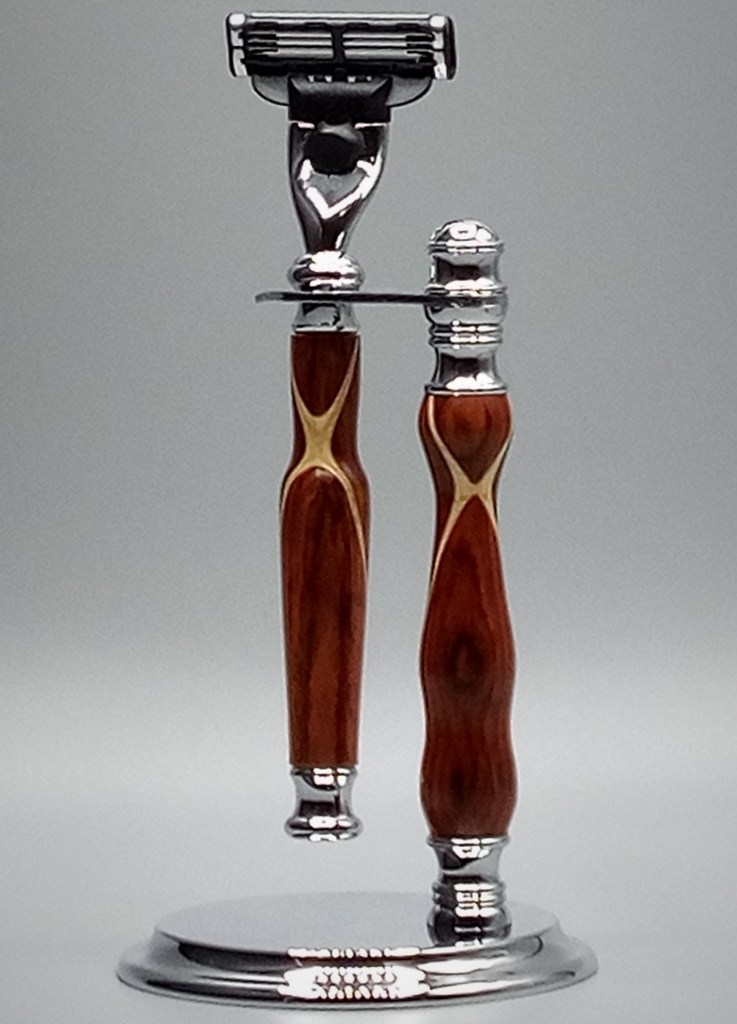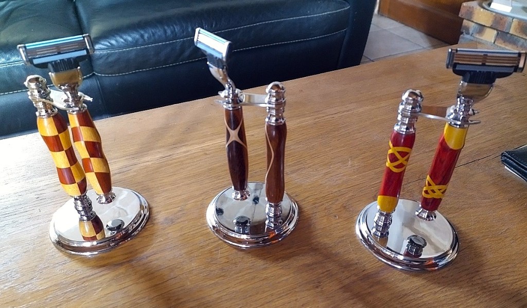 Vaporisateur en Red heart avec inserts en filets croisésCharme et AmaranteBlaireau en Xylia et bol en Raku sur socle en Frêneavec deux inserts ronds en cerisierRasoir sur socle en bois. Mécanisme « Gillette mach 3 » Buis et Padouk